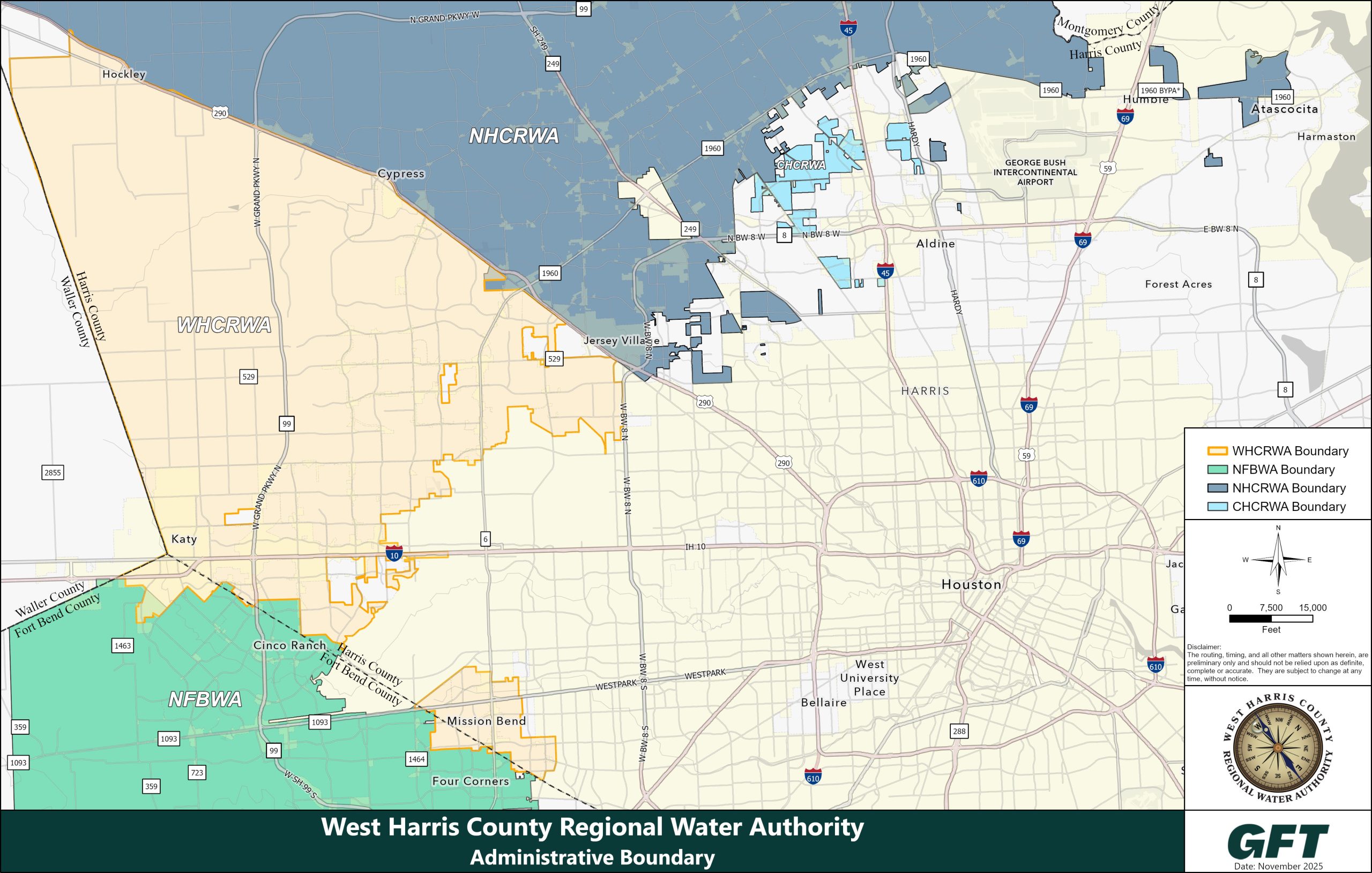 The boundaries of the WHCRWA are generally U.S. 290 on the north/northeast, Houston city limits on the east, Harris/Fort Bend county line on the south and Harris/Waller county line on the west. There are currently 120 municipal water providers (utility districts plus the City of Katy) within the boundaries of the WHCRWA and eight municipal utility districts located outside the boundaries of the WHCRWA included in the Groundwater Reduction Plan (GRP). These municipal water providers and independent well owners currently operate 317 groundwater wells that are subject to GRP requirements. The total water demand of these users in 2018 was approximately 22.3 billion gallons. All these numbers continue to change with the growth occurring in this region.