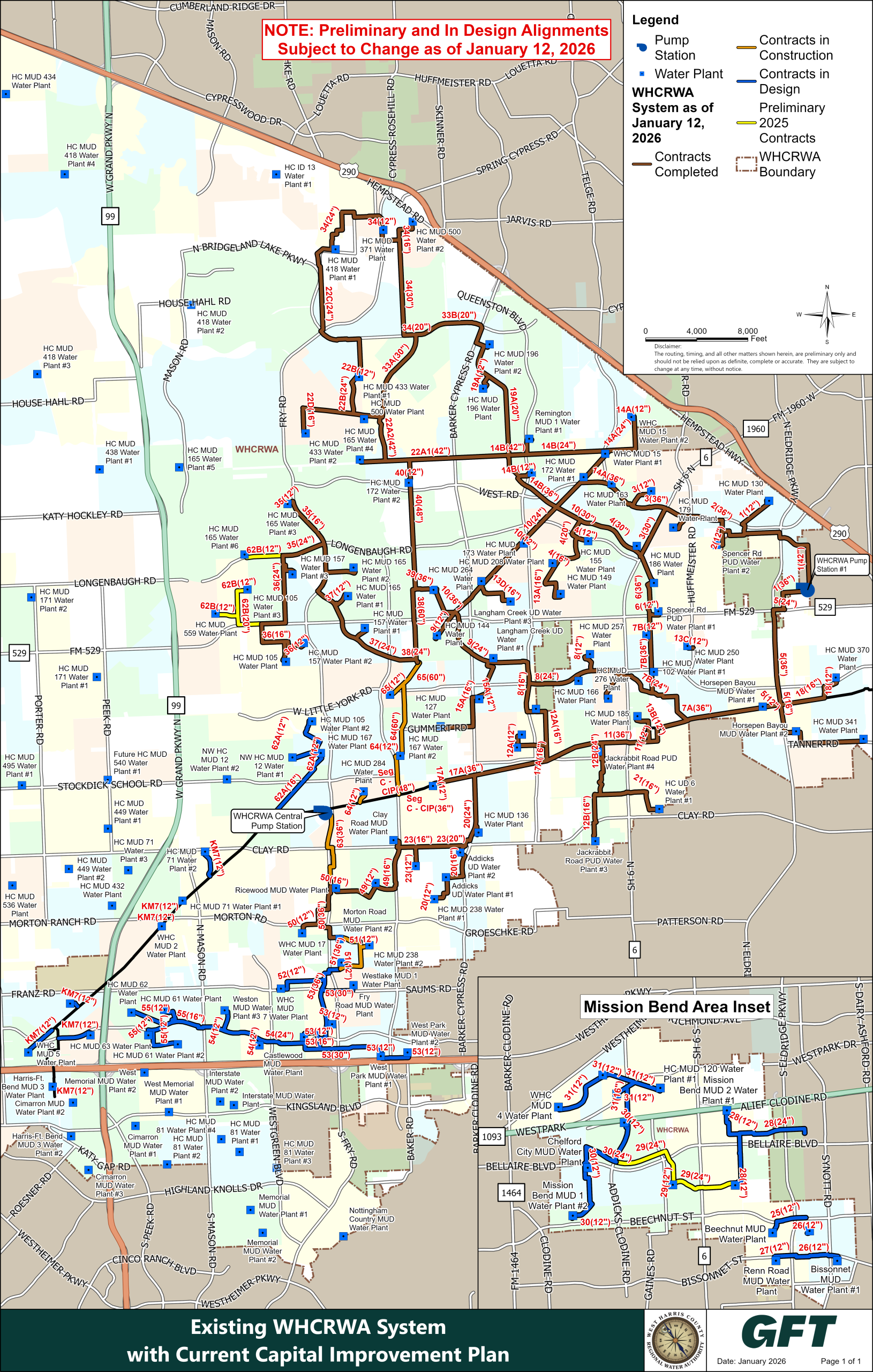 The pipelines constructed along West Little York Road, between Highway 6 and Barker-Cypress Road, and near the FM 529/Highway 6 intersection include Harris County MUDs 264, 70, 173, 257, 102, 250, 186, Langham Creek MUD and Spencer Road. Those MUDs serve the Concord Crossing, Jamestown Colony, Langham Creek Colony, Georgetown Colony, Cumberland Place, Hearthstone Place, Hearthstone, Fairway West, Copperfield Place, Southdown Village, Sect. 4, 6, 7, Southpoint Village, Copperfield Mall, Ashley Grove, Westcreek Village, Fairfax Landing, Paddock, Westgate, Copper Lakes and Lone Oak subdivisions.